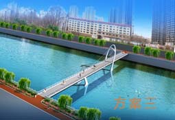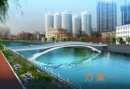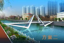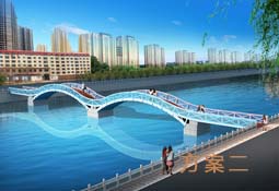 本方案采用上承式拱桥,犹如天上飞来的一条彩虹,安卧在北川河水面之上。栏杆选用具有现代气息的玻璃钢栏杆,整桥外形优雅、大方靓丽、充满现代都市气息。
