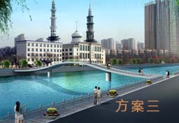 本方案采用了小蘑菇凉亭造型,更显秀气,主桥采用S型曲线与蘑菇凉亭的组合,犹如一条曲径通幽的小道,与桥下的河水、周围的绿地、八角亭、景观石拱桥相融合,宛如在夏都西宁装点了一处苏州园林。